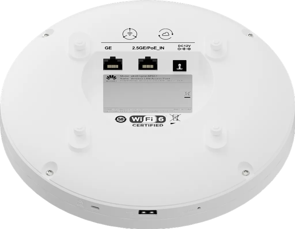 AP661. AP Huawei eKit Wifi 6 con velocidad de 6.575 Gbps cuenta con 3 bandas recomendado para 300 usuarios concurrentes cuenta con 1 puertos de 2.5Gbps y 1 puerto 1GE alcance optimo de 40m