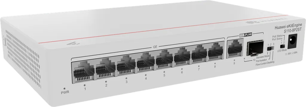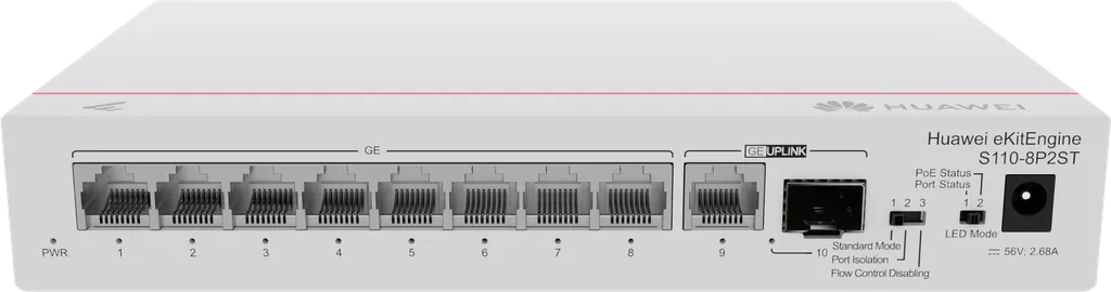 El Huawei S110-8P2ST es un switch de capa 2 compacto y económico que ofrece 8 puertos 10/100/1000Base-T con PoE+ y 1 puerto SFP 1Gbps, ideal para pequeñas implementaciones que requieren alimentación PoE en un formato reducido.